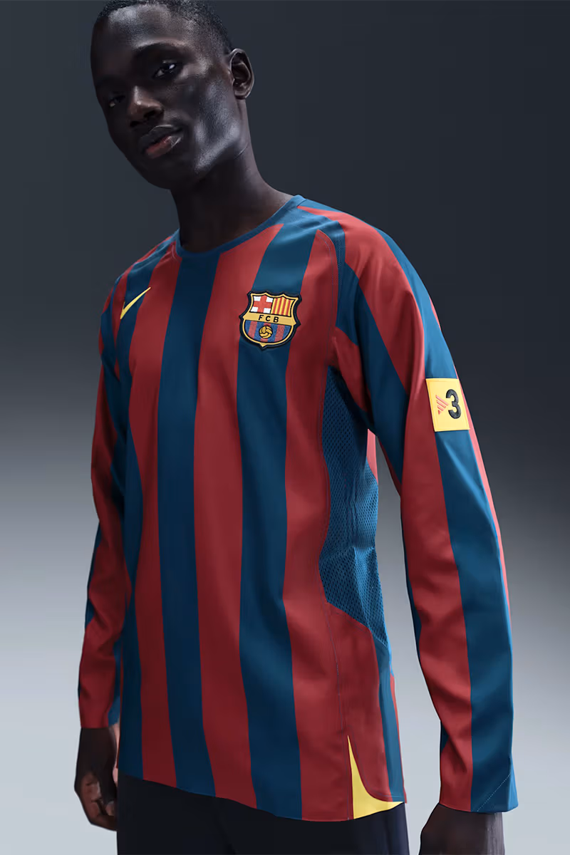 同コレクションは、当時のキットデザインをベースに、カラーリングやエンブレム、細部のディテールに至るまで忠実に再現したリイシュープロダクトだ。20年前、ピッチで戦ったレジェンドたちが身にまとったオリジナルをオマージュしたデザインのプレミアムキットが存在感を放つ。ビンテージのバルサのディテールを施し、着る者に「ブラウグラナ」の血が流れることを証明する。